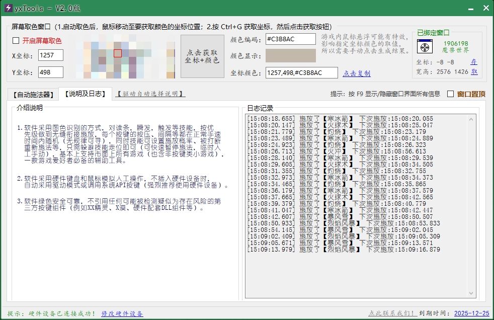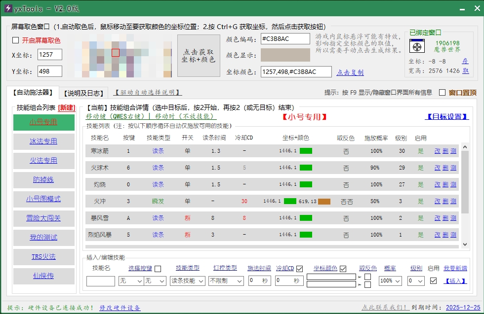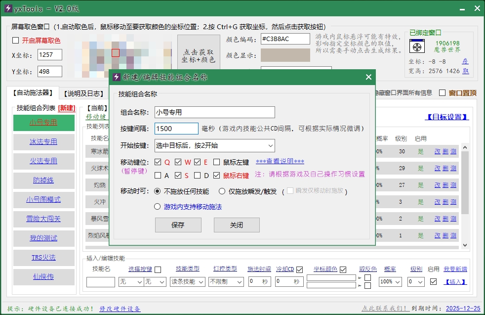- 绑定游戏窗口(支持存取窗口位置及大小),并选中开启施法器功能